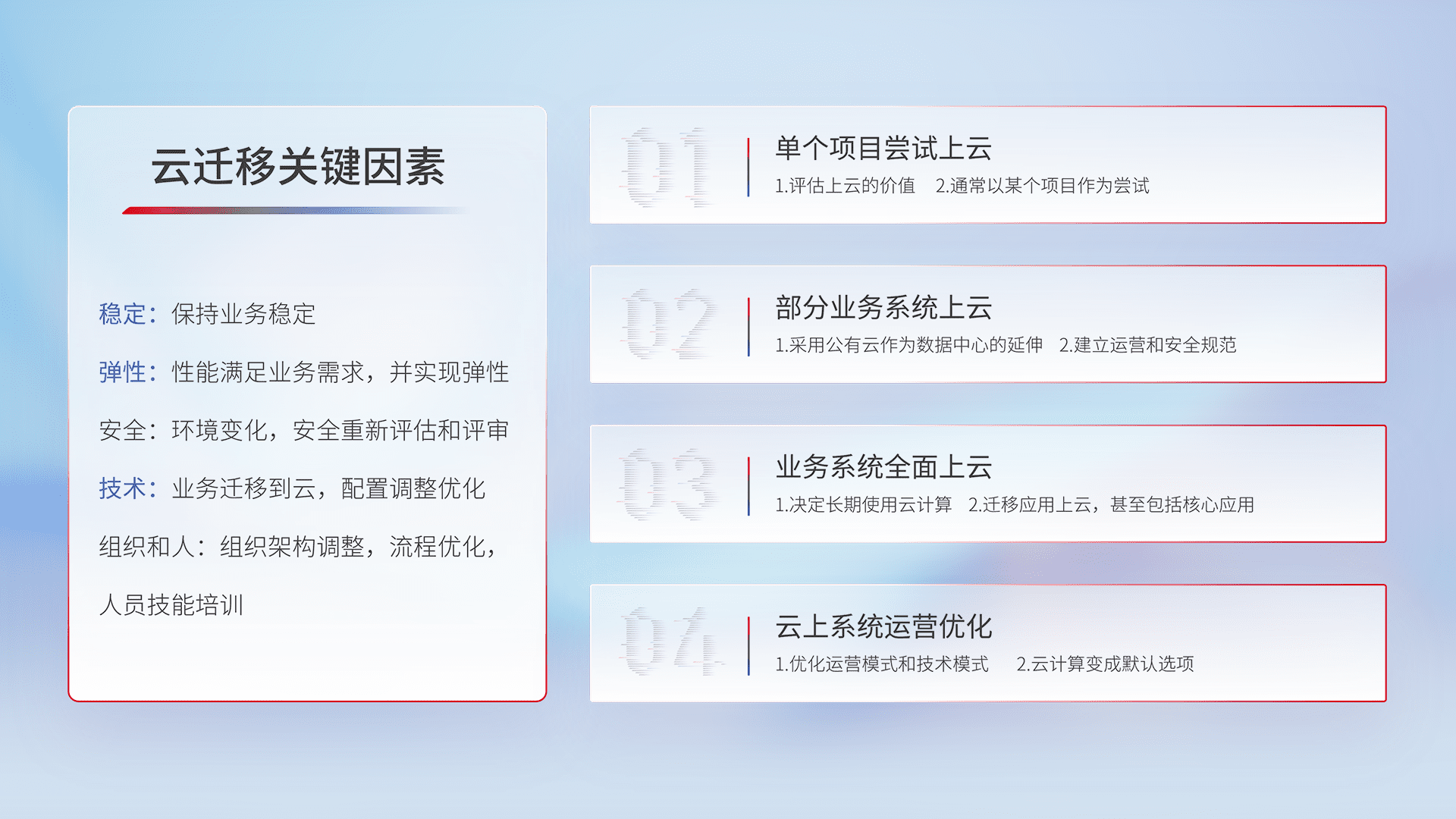 结合实际业务,,,,从规划设计、、云平台选型、、云原生改造、、、、数据迁移、、集成交付,,迁移全过程为客户识别最佳上云路径,,,做好风险识别管理,,设计网络架构、、、、身份权限、、安全审计合规、、、、操作审计、、日志审计、、、监控告警策略、、多站点容灾设计等,,,对云上基础设施进行整体规划,,,提升IT治理水平,,,以满足弹性、、高可用、、、高性能的需求。。。