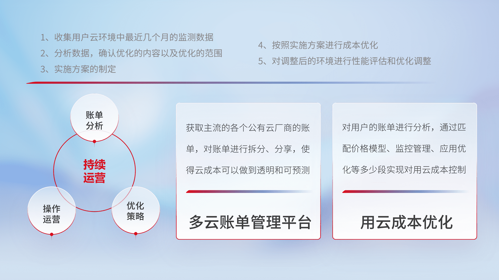 通过多云纳管,,以统一的资源数据模型把客户的云资源进行抽象和封装,,,,进而实现对多云资源的统一操作,,,,保障云资源管理的可靠性、、、、稳定性与可用性。。。。量身定制化运维内容,,,配置、、、开发运维、、、补丁管理、、备份、、、监控、、认证和访问管理、、、审计和日常巡检等,,,保障在用云过程中的可靠度,,稳定度以及高可用率。。